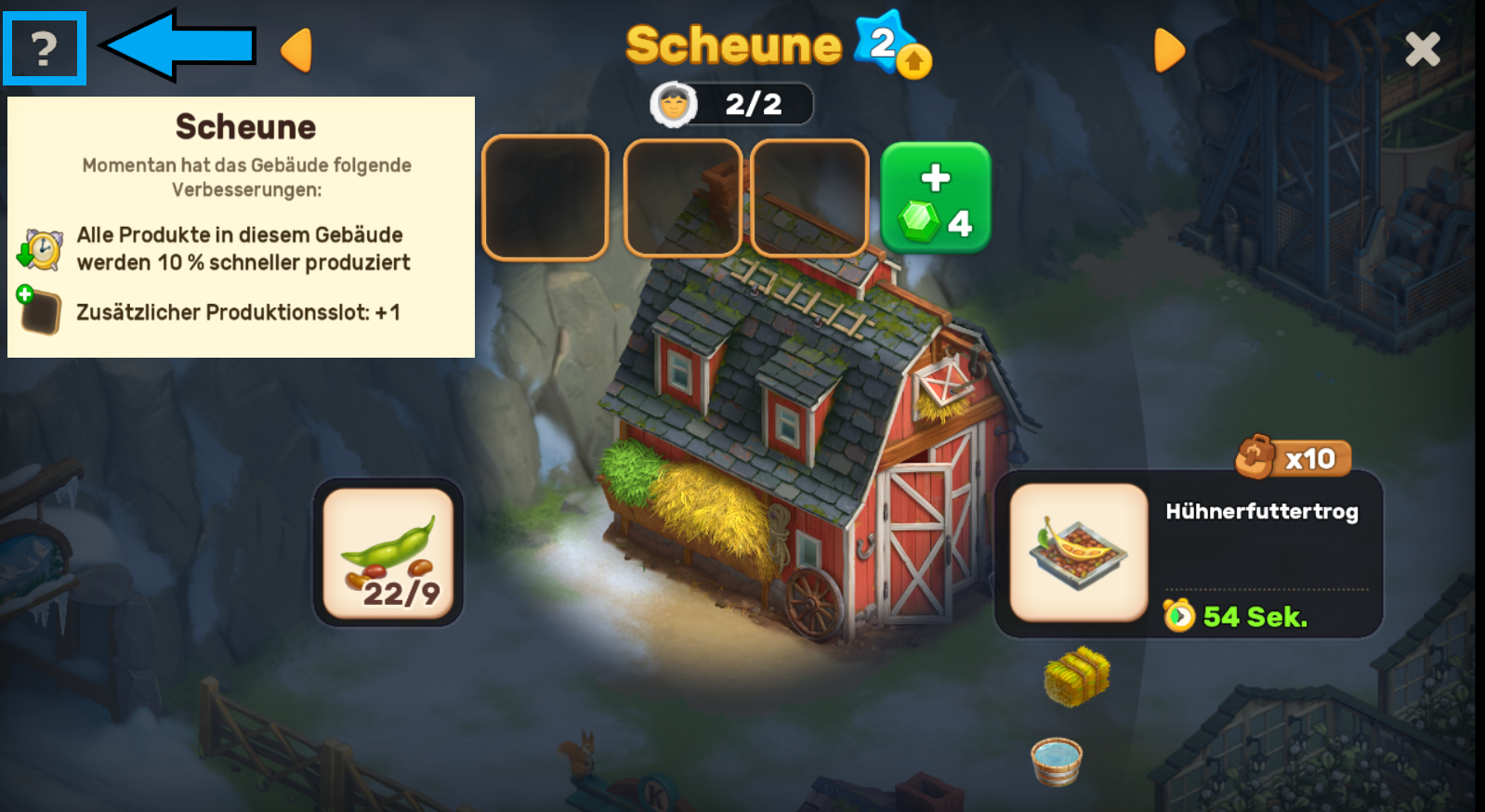 Um alle aktuell freigeschalteten Verbesserungen eines Gebäudes zu sehen, tippe auf das große Fragezeichen „?“ in der oberen linken Ecke des Bildschirms.