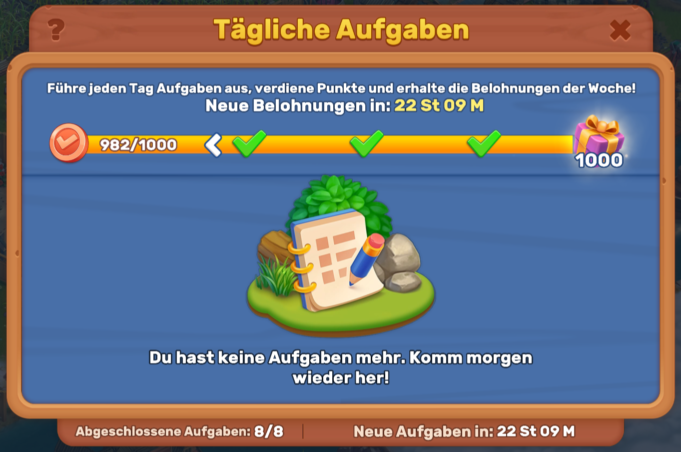 Wenn du keine 1000 Punkte erreicht hast, bedeutet das, dass du an manchen Tagen nicht genug Tägliche Aufgaben abgeschlossen hast.
