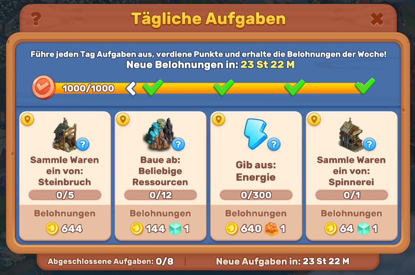 Du kannst aber trotzdem weiterhin reguläre Münzen und verschiedene kleinere Belohnungen erhalten, zum Beispiel Gegenstände für den Ofen, wenn du die restlichen Täglichen Aufgaben abschließt.
