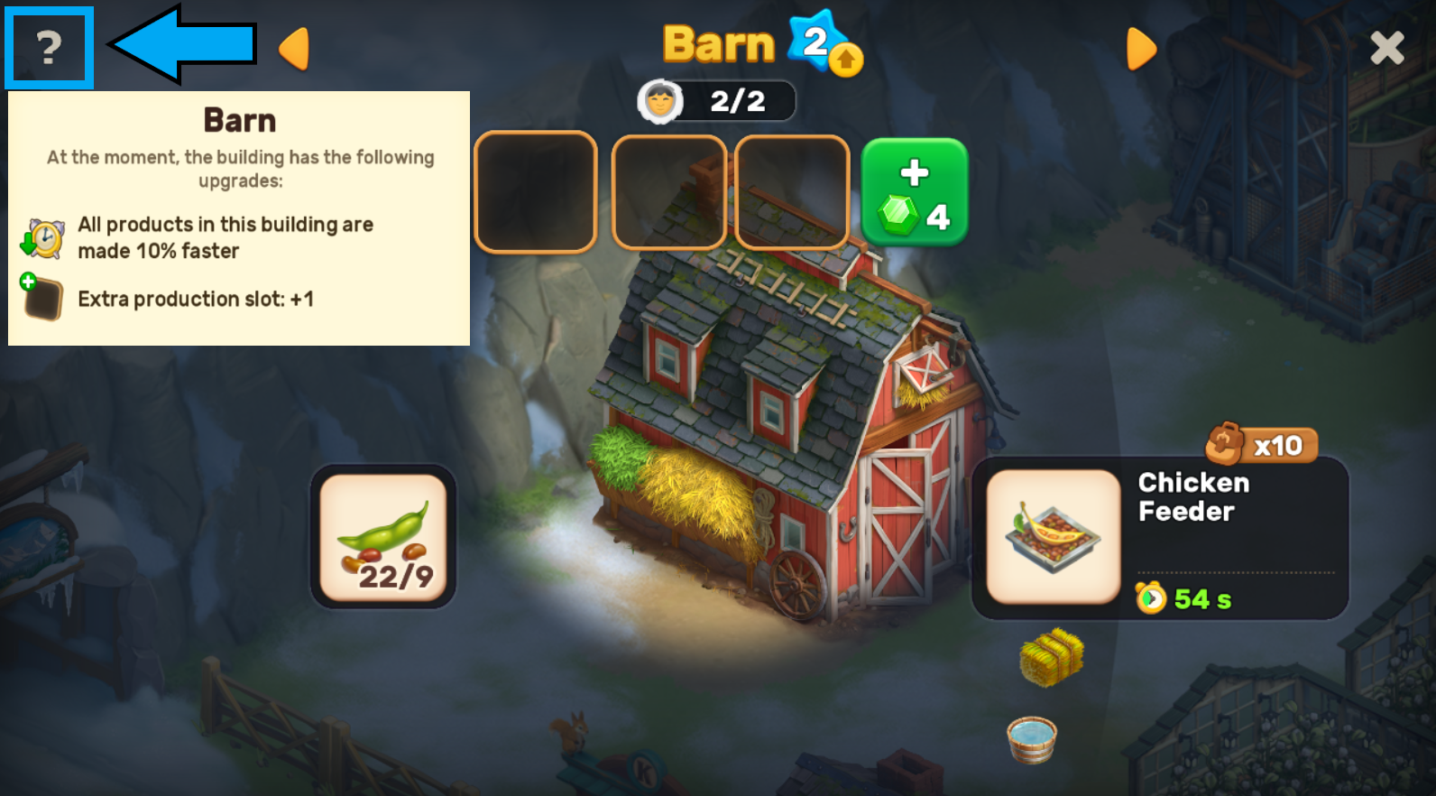 To see all the upgrades currently unlocked in a building, tap the big question mark “?” in the top left corner of the screen.