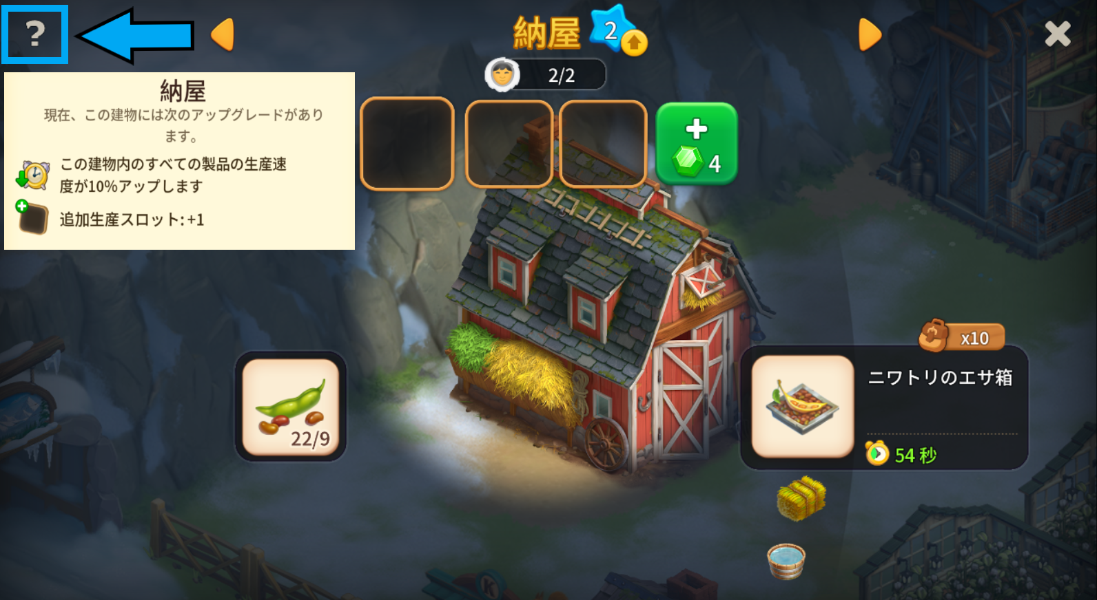 確定の建物のアンロック済みアップグレードを確認するには、画面左上の大きな「?」マークをタップしてください。