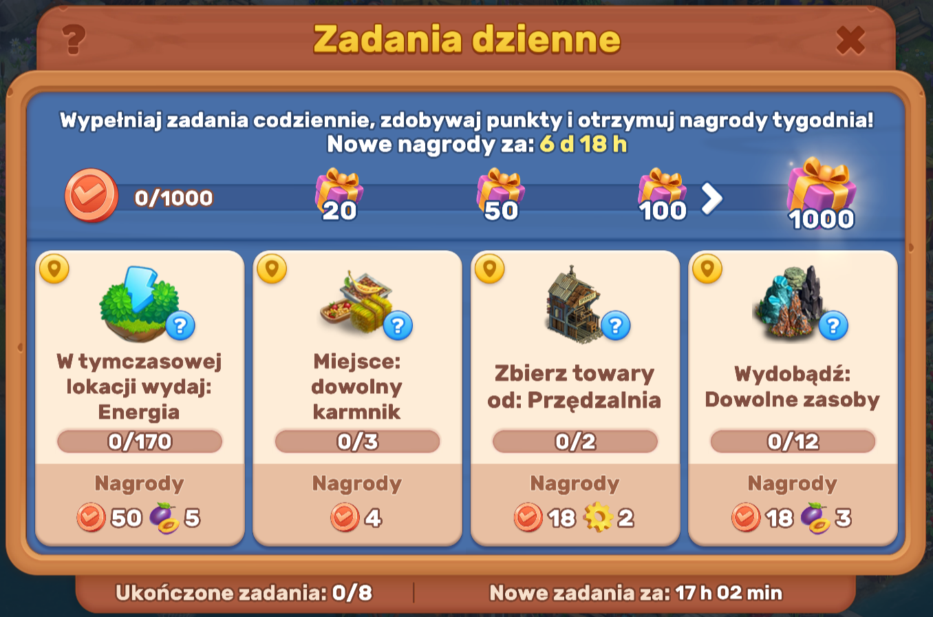 Aby mieć pewność, że odbierzesz nagrodę główną, wykonuj zadania regularnie przez cały tydzień i zwracaj uwagę na licznik nad paskiem nagród — pokazuje on, ile czasu pozostało do kolejnego resetu.