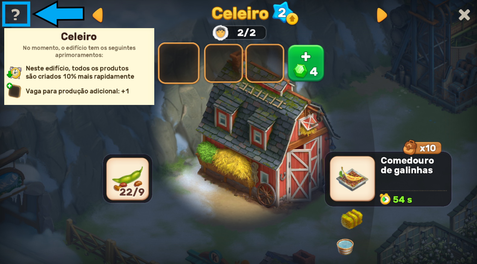 Para ver todas as melhorias já desbloqueadas em uma construção, toque no ponto de interrogação grande no canto superior esquerdo da tela.