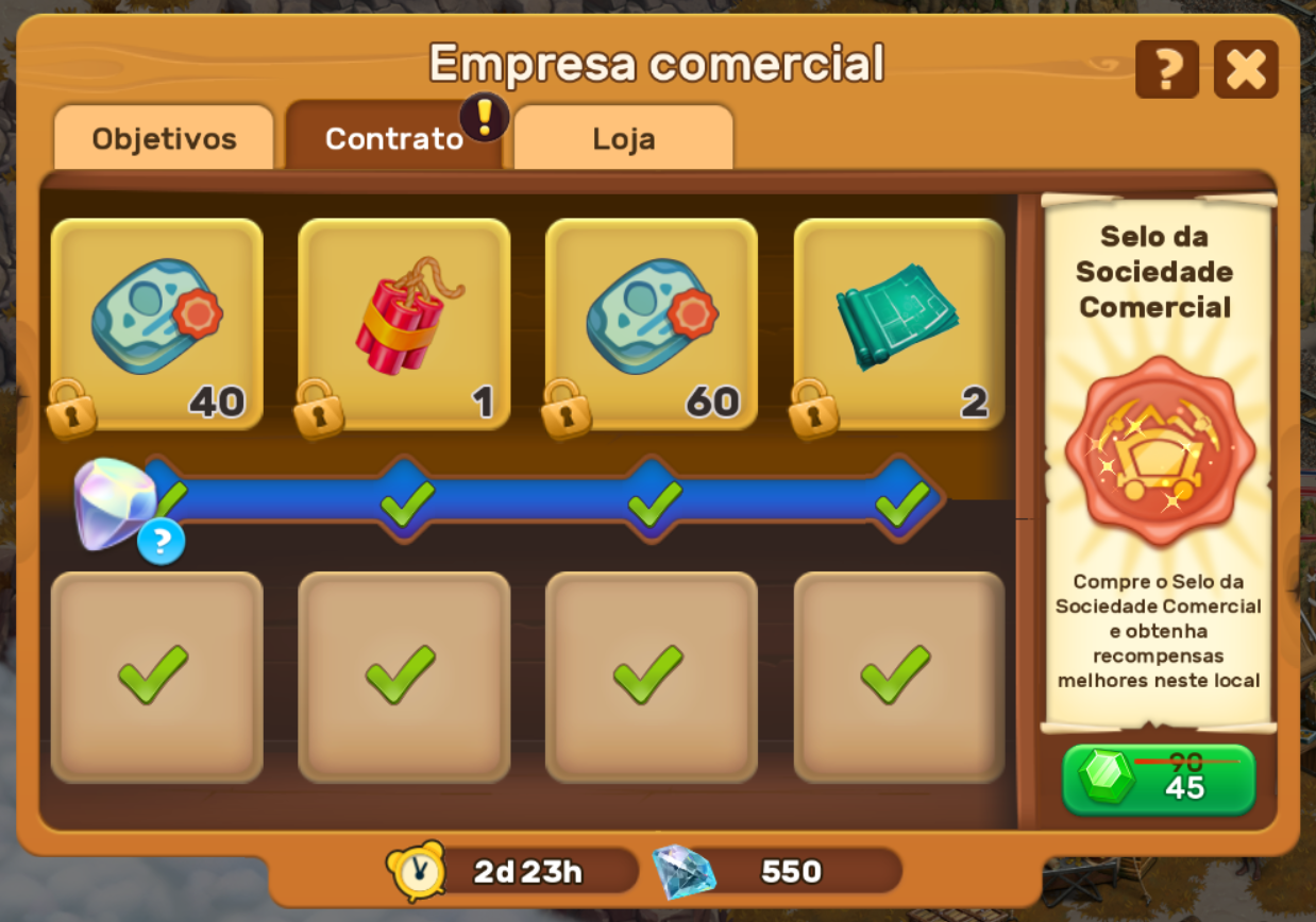 Há 1 contrato (barra de níquel, diamantes, petróleo, carvalho vermelho) por localização da sociedade comercial. Cada contrato é composto por tarefas separadas que devem ser concluídas antes que o tempo acabe. Quando todas as tarefas forem concluídas, o contrato é contabilizado para o progresso da expansão. Ao atingir a quantidade necessária, a área será desbloqueada.