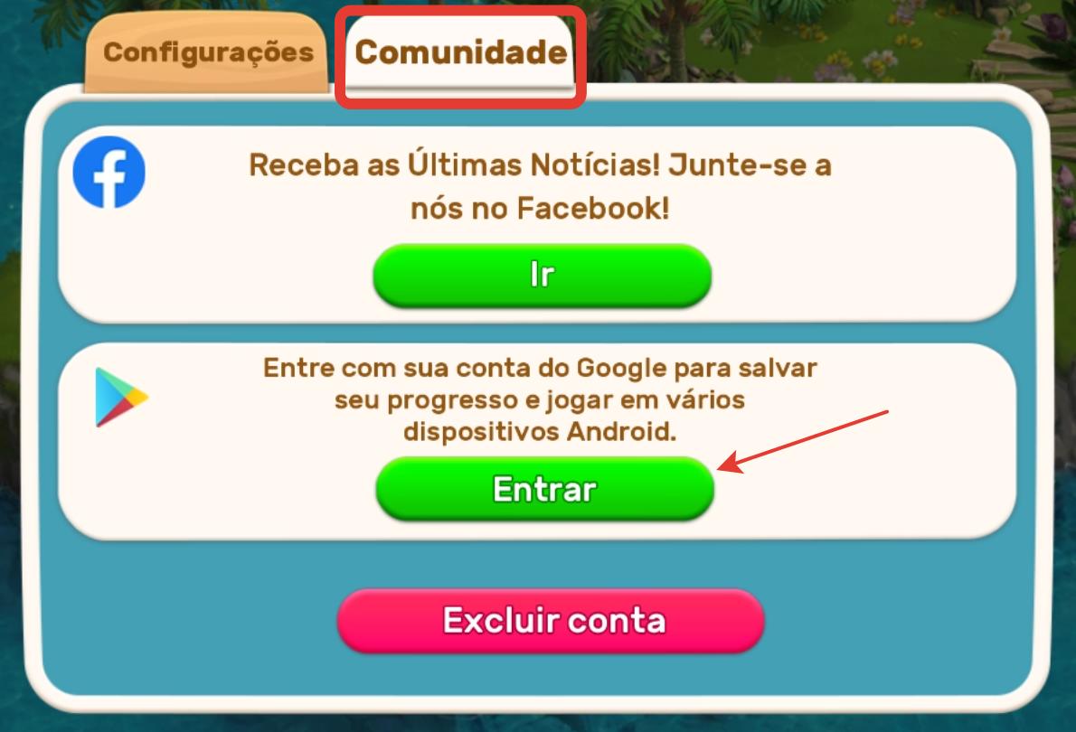 Podes restaurar o teu progresso no jogo se este estiver ligado à tua conta Google Play, Game Center ou Amazon. Escolhe a tua conta quando inicias o jogo ou vai a  Definições do jogo - Comunidade -  Entrar