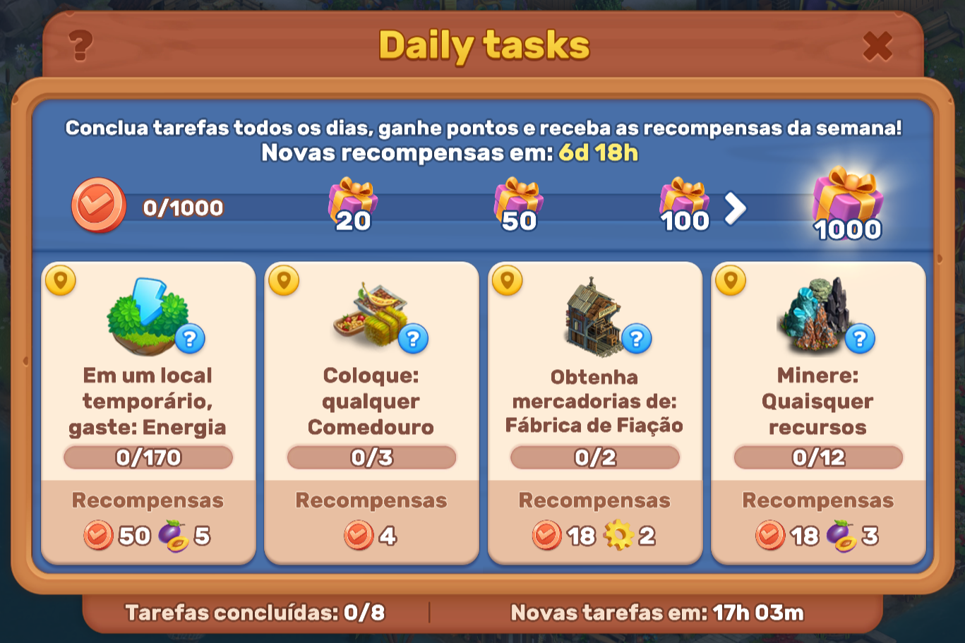 Para garantir a recompensa final, tente concluir tarefas de forma consistente ao longo da semana e fique atento ao cronómetro acima da barra, que indica quanto tempo falta para o próximo reinício.