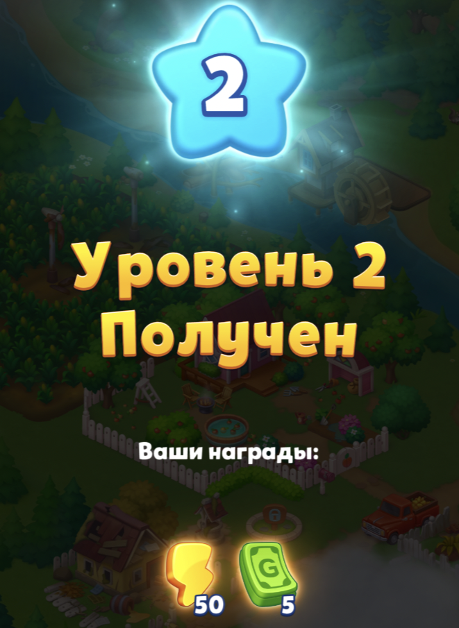 Очки опыта повышают уровень. Чем выше уровень – тем больше возможностей: новые зоны фермы, доступ к постройкам, а также приятные награды, такие как мердж-энергия