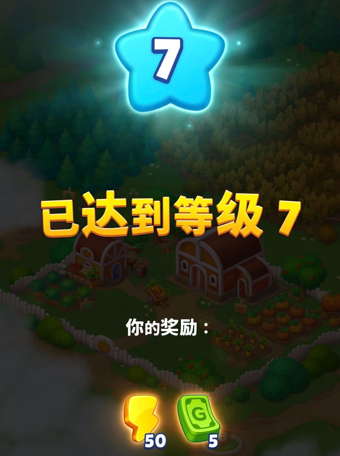 经验值会提升你的等级。等级越高,解锁的可能性就越多:农场的新区域、更多建筑的访问权限,以及有价值的奖励,例如合并能量
