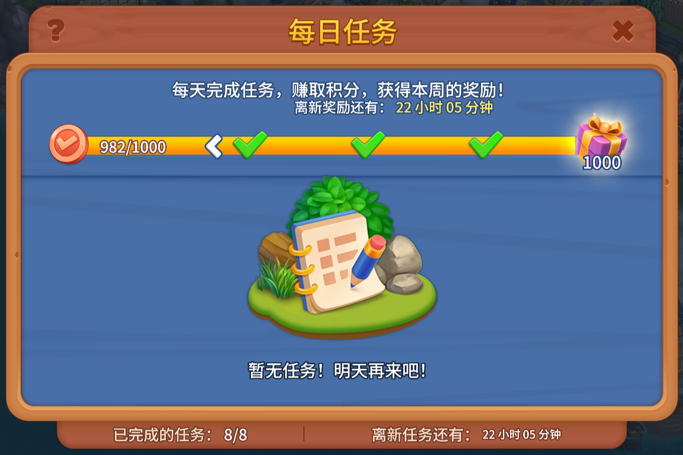 如果当前没有可用任务,说明新的任务尚未刷新,目前无法获取剩余的积分。为了确保你能拿到最终奖励,建议你整周都坚持完成每日任务,这样你就有足够的时间在进度条重置前达到 1000 分。